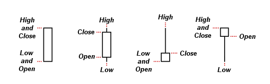 The following images display typical candlestick pattern formations and how to read them. In the cases where the opening price is lower than the closing price, the candlestick bar is called an “up” or “open” candlestick. They are considered to be bullish. I use white to represent open candlesticks, but green is another popular color.