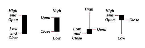 When the open of a candlestick bar is higher than the closing price, then the candlestick is considered bearish and is called a “down” or “closed” candlestick. I use black to represent this type of candlestick, although red is also frequently used.
